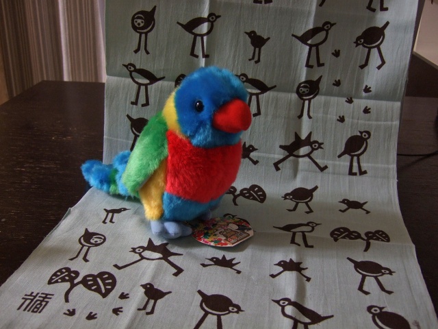 シロハラクイナという鳥さん柄の手ぬぐいとゴシキセイガイ?のぬいぐるみ。
