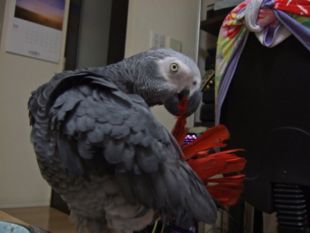 カラーがなかなか取れないね… うちもまたまたハゲ度UP中なので、ヨウムってややこしいな~ってまた思ってるとこです。 やっぱりあ~ぽんさんも慣れたとはいえカラーはないほうがいいよね…。 転がしたり、ぶら下げたり…って楽しそうだ。 気の毒に思いつつもてるてる坊主みたいに見えるあのカラー結構かわいくて好きなんだけど、でもやっぱり早く取れるといいね~。 うちももう何年ハゲてるんだろ… Re:記念日おめでとう~